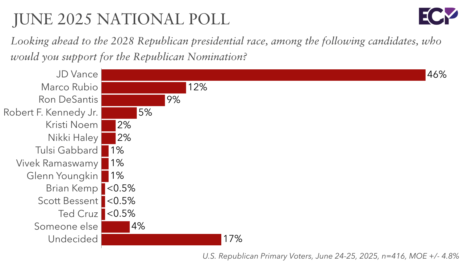 In second is Secretary of State Marco Rubio at 12% and Florida Gov. Ron DeSantis is third at 9%. They are followed by Health and Human Services Secretary Robert F. Kennedy Jr. at 5% and Homeland Security Secretary Kristi Noem at 2%. Just 17% of Republicans are undecided.