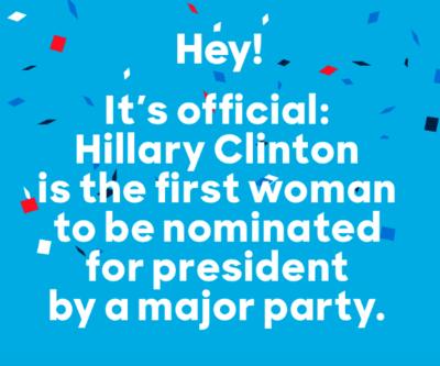 “Hey, it’s official. Hillary Clinton is the first woman to be nominated for president by a major party,” the campaign bragged.