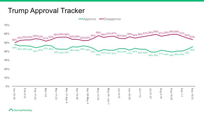 “Trump’s job approval rating rose 3 points to 45 percent over the past week, and his disapproval dropped 2 to 53 percent. That’s Trump’s best approval rating in SurveyMonkey’s tracking since late April. It extends a trend evident in our data and the polling averages over the past 2-3 weeks,” said the pollster.