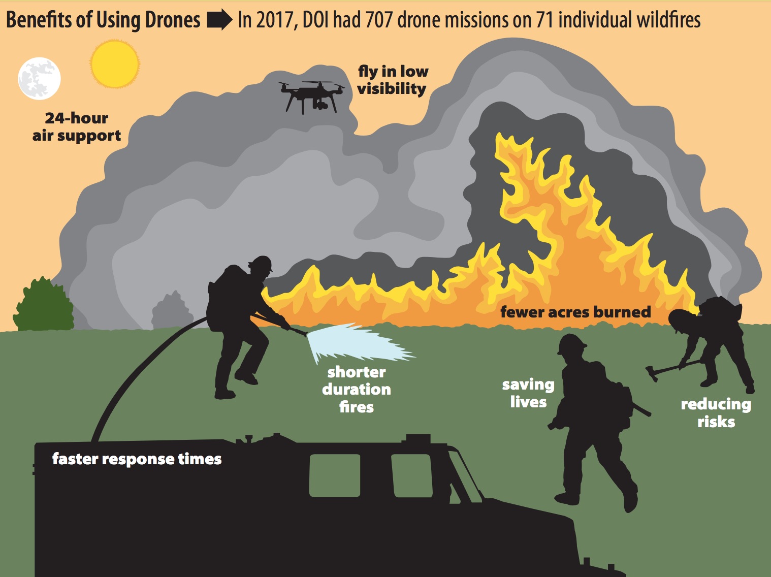 “Adding drone support to fire suppression efforts could dramatically reduce the size and cost of wildfires, potentially saving millions of dollars and hundreds of thousands of acres with triple the hours of critical aviation support,” said Jeff Rupert, acting director of the Office of Wildland Fire.