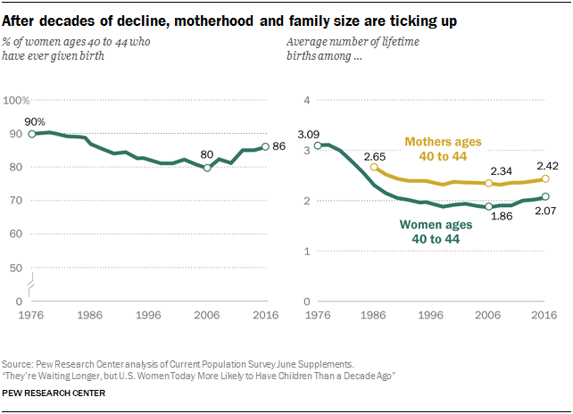 Pew added, “Not only are women more likely to be mothers than in the past, but they are having more children. Overall, women have 2.07 children during their lives on average – up from 1.86 in 2006, the lowest number on record. And among those who are mothers, family size has also ticked up. In 2016, mothers at the end of their childbearing years had had about 2.42 children, compared with a low of 2.31 in 2008.”