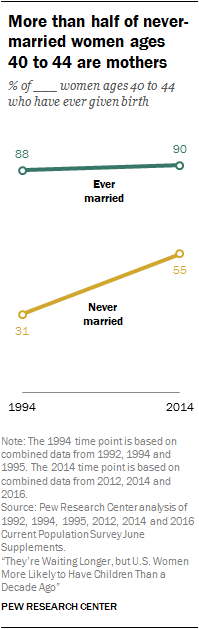 - The majority of women ages 40 to 44 who have never married have had a baby. It’s up from 9 percent in 1994 to 15 percent in 2014.