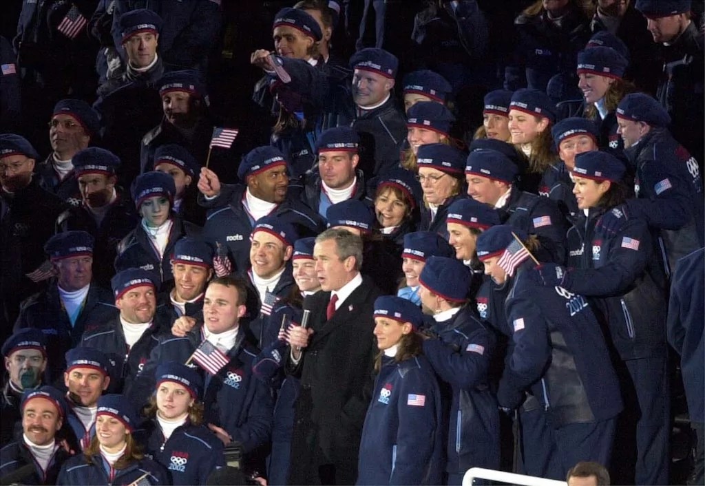 President George W. Bush is surrounded by members of the U.S. Olympic team during the opening ceremonies of the 2002 Winter Olympics in Salt Lake City, Utah, Feb. 8, 2002. (AP Photo/Lawrence Jackson)