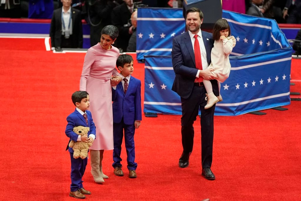 Second lady Usha Vance and Vice President JD Vance with their three children arrive on stage to an indoor Presidential Inauguration parade event in Washington, Monday, Jan. 20, 2025. (AP Photo/Mark Schiefelbein)