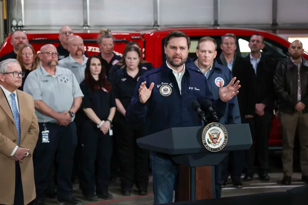 The vice president called for the rebuilding of East Palestine and sent the well wishes of President Donald Trump, who is in Washington and dealing with a possible trade war.