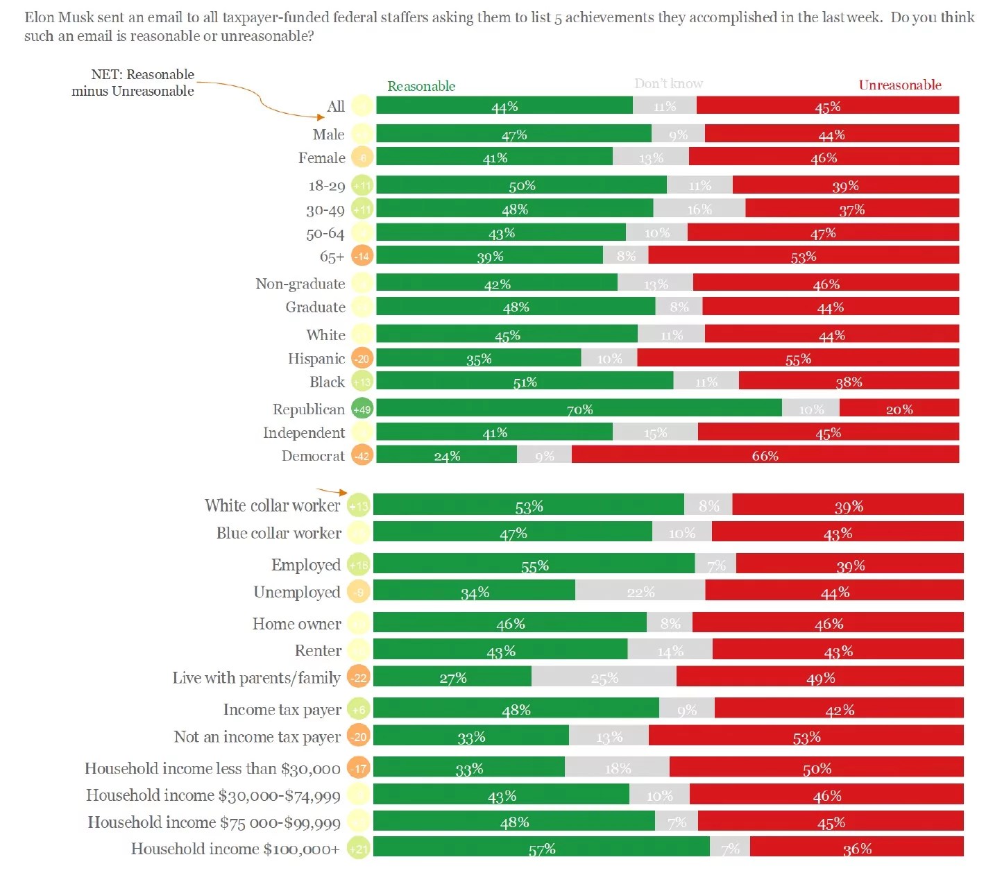 A poll published by J.L. Partners on Wednesday found that 55% of workers would describe the “five things” email that Musk and DOGE sent federal employees earlier this month as “reasonable,” while 39% would call it “unreasonable.”