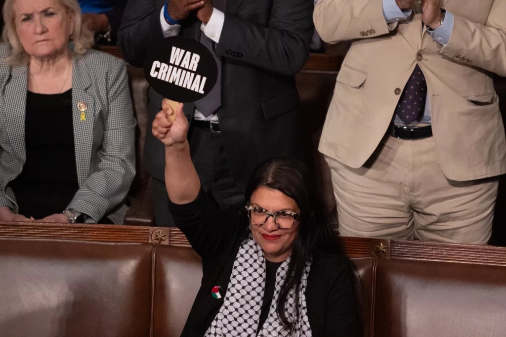 Dozens of Democratic politicians boycotted Netanyahu’s address due to their concerns over Israel’s conduct in its war against Hamas in Gaza. Rep. Rashida Tlaib (D-MI) silently protested his address in the chamber by holding a sign reading “War Criminal.”