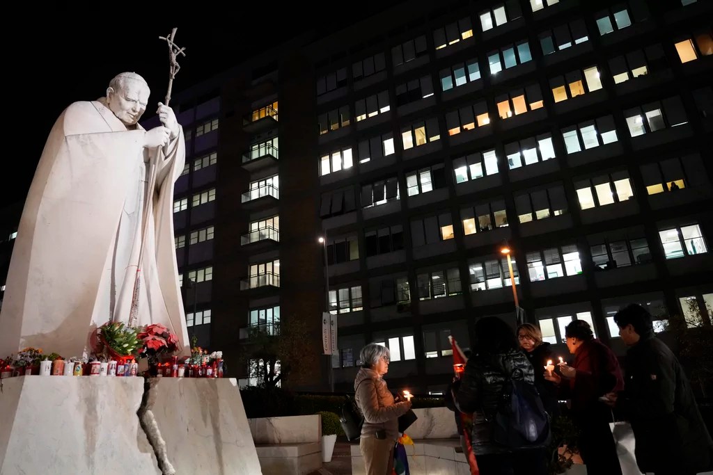 Members of the faithful have staged vigils for the pope outside the hospital since his intake, leaving candles, prayer cards, and other devotional materials in support.