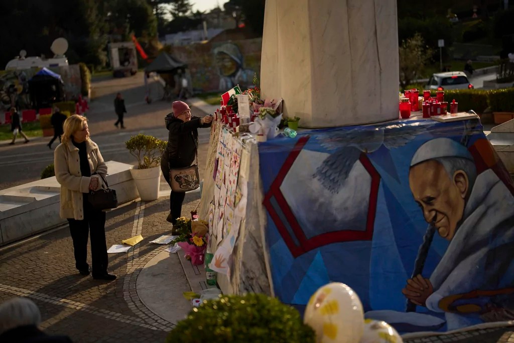 Catholics have been gathering nightly outside St. Peter’s Basilica for the rosary recitations offered for the pope’s sake. The prayers are led each night by a different member of the College of Cardinals.