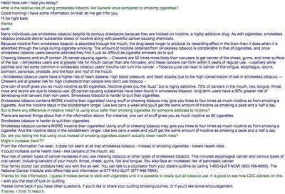 But UCanQuit2’s tobacco cessation service appears dead-set against providing consumers with this knowledge. Professor David T. Sweanor, a veteran tobacco control advocate, asked the service whether there was any difference in terms of risk between smoking cigarettes and using smokeless tobacco.