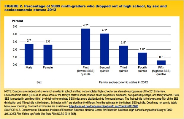 Students in low income families are more likely to drop out than students in wealthier families. Only 0.6 percent of students in the highest fifth of