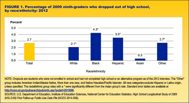 Only 0.3 percent of Asian students are dropouts. White students are actually seven times more likely to drop out. Black students are 14 times more likely than Asians to drop out, while Hispanics are almost 12 times more likely than Asians to drop out.
