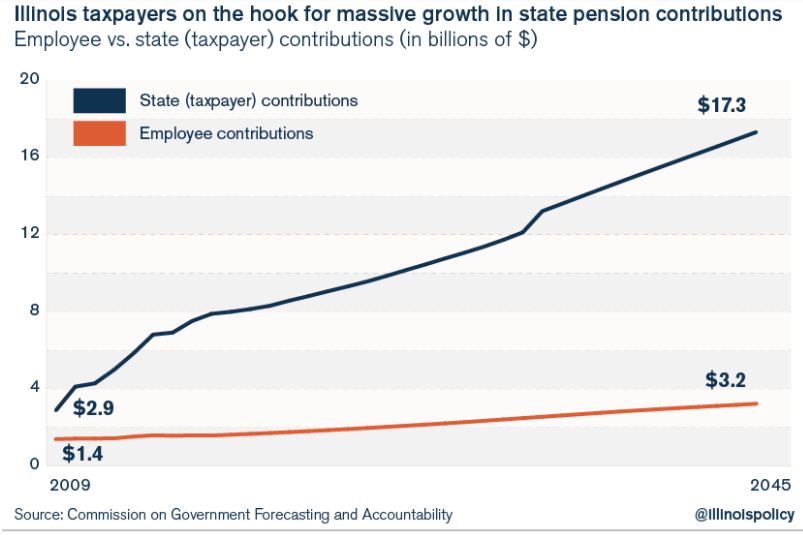 The taxpayers are Illinois’ forgotten man. It’s not just that they pay high taxes in return for poor services — it’s that they are effective feudal servants to the unions. Consider this graph. It encapsulates the vast discrepancy between what Illinois government workers pay toward their pensions and what private taxpayers pay.