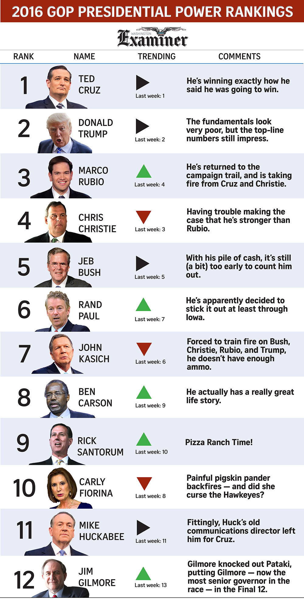 We consider Ted Cruz the most important candidate in the race because his lead in Iowa is on more stable ground than Donald Trump’s lead in New Hampshire (and national polls at this point tell us very little). The big contest here is the three-way fight to be the establishment alternative to Trump and Cruz. It’s Rubio-vs-Bush-vs-Christie in that battle, with Kasich just behind that pack.