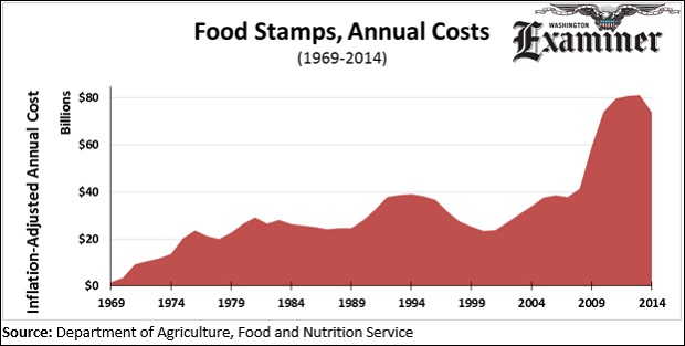More than 46 million Americans received food stamps in 2014, 20 million more than before the recession started. Total costs for the year, which will end up being roughly $80 billion, are twice as high as in 2007, when costs were $38 billion, after adjusting for inflation.