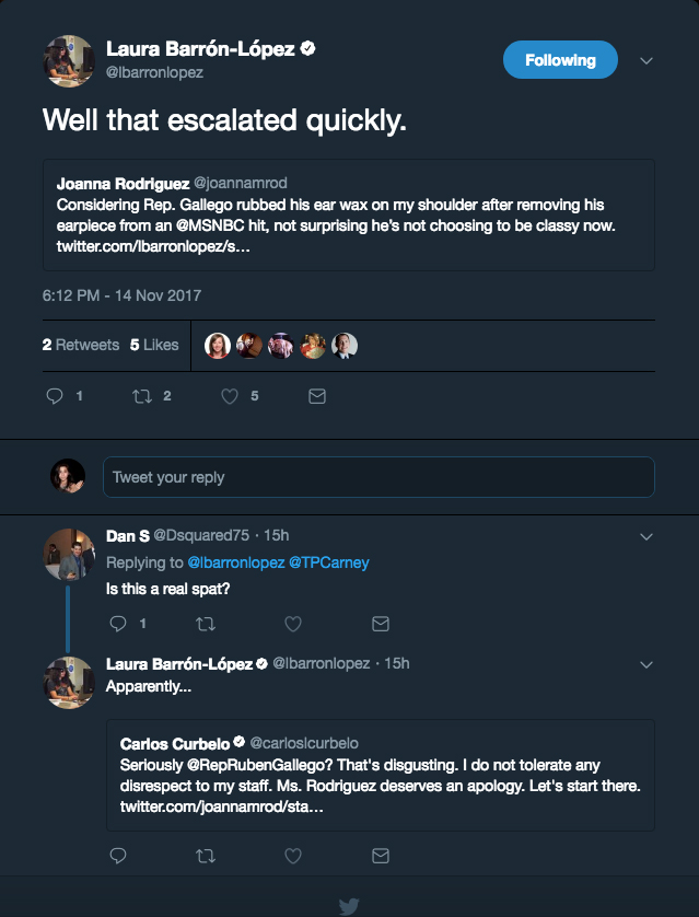 As this update was being posted to Twitter, Curbelo’s Communications Director, Joanna Rodriguez, tweeted at Barrón-López. She claimed that Gallego “rubbed his ear wax on my shoulder after removing his earpiece” from a TV hit.