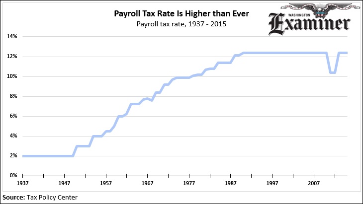 With the deficit set to rise, you might think the payroll tax rate is historically low. To the contrary, it’s never been higher than it is now. The rate first rose to a record-high 12.4 percent in 1990 and has stood there ever since, except for a two year temporary cut. Back when the program started, workers only lost 2 percent of their salary to payroll taxes.