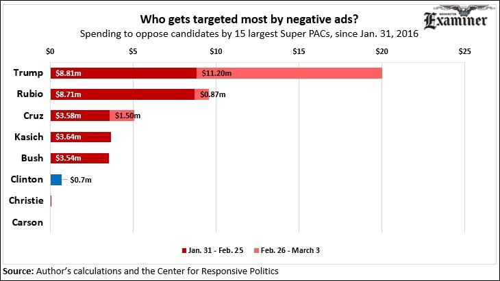 Prior to Feb. 26, Donald Trump was getting attacked most often by negative spending, but only by $100,000 more than Marco Rubio. In the most recent week of available data, however, super PACs have set their sights on Trump.