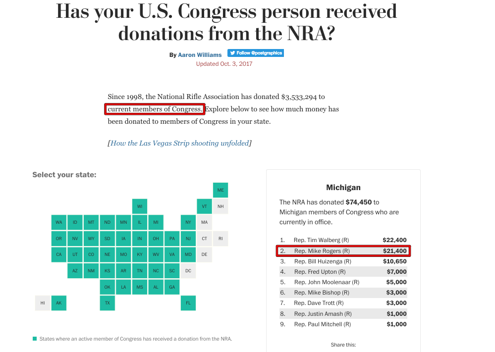 “Since 1998, the National Rifle Association has donated $3,533,294 to current members of Congress. Explore below to see how much money has been donated to members of Congress in your state,” it reads [emphasis added].