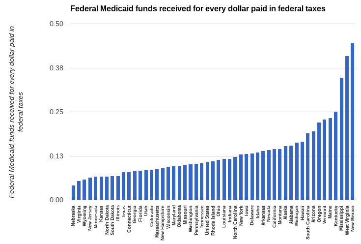 Then again, a lot of rural states are shortchanged in this respect, whereas New York and California both take more than the national average. Here’s a look at how much federal Medicaid money (the biggest safety-net program by a long way) goes to each state for every dollar its residents pay in taxes: