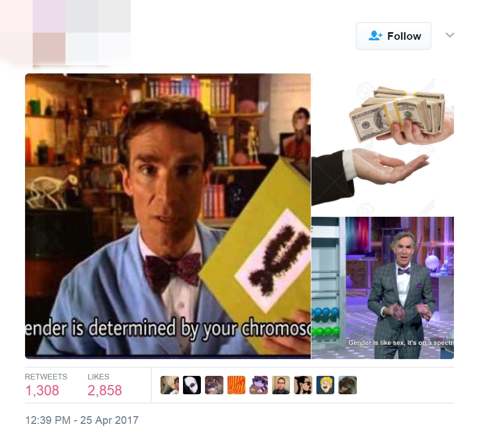 Though there are several counterarguments to be made in response to things like Nye’s specific claim that, “Gender is like sex, it’s on the spectrum,” circulating the following screengrab from episode three of season five of his old television program isn’t one of them.