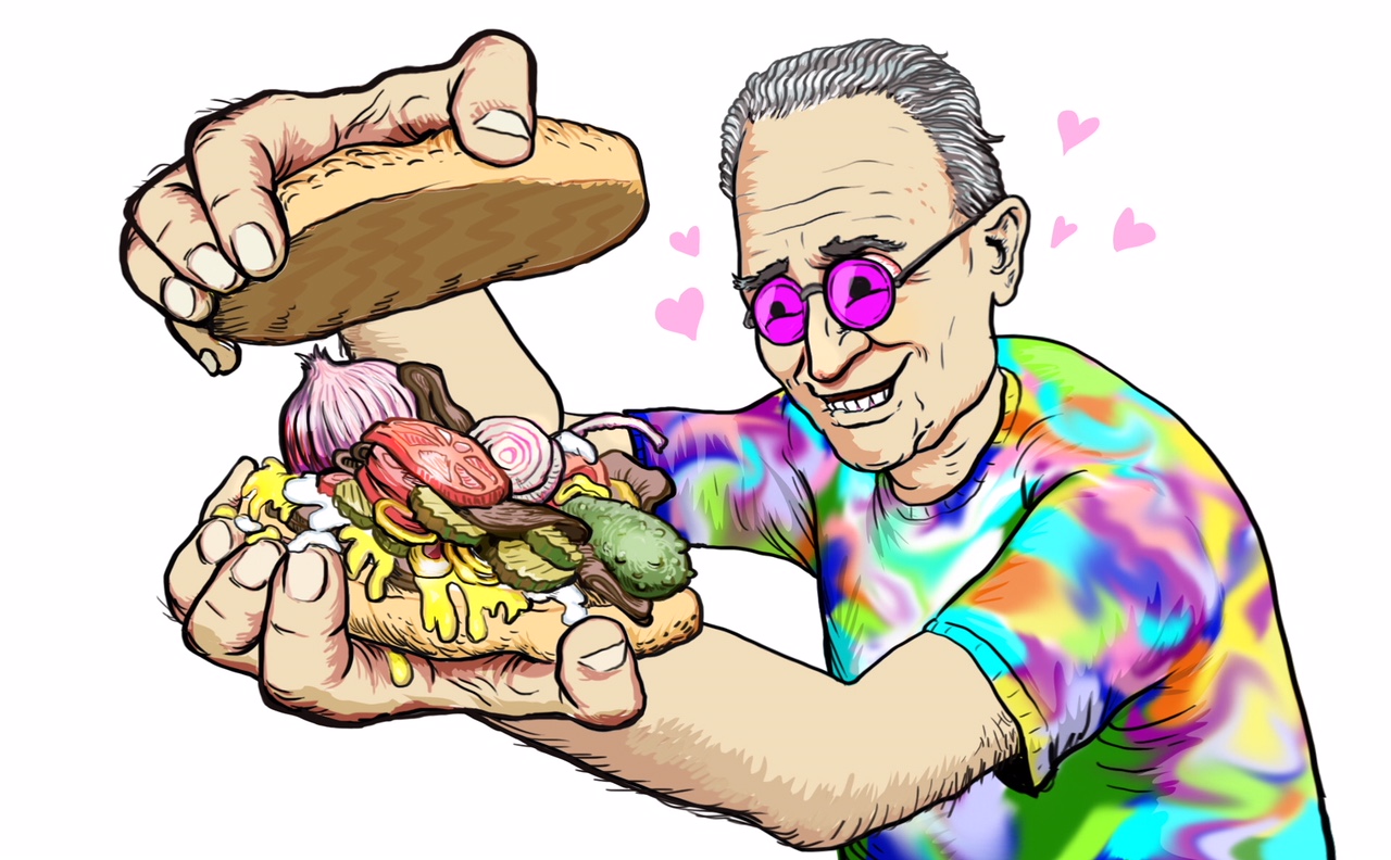 Schumer’s favorite sandwich includes two whole layers of pickles, extra onions, extra tomatoes, jalapeños, banana peppers, mayo, mustard and a slab of roast beef.