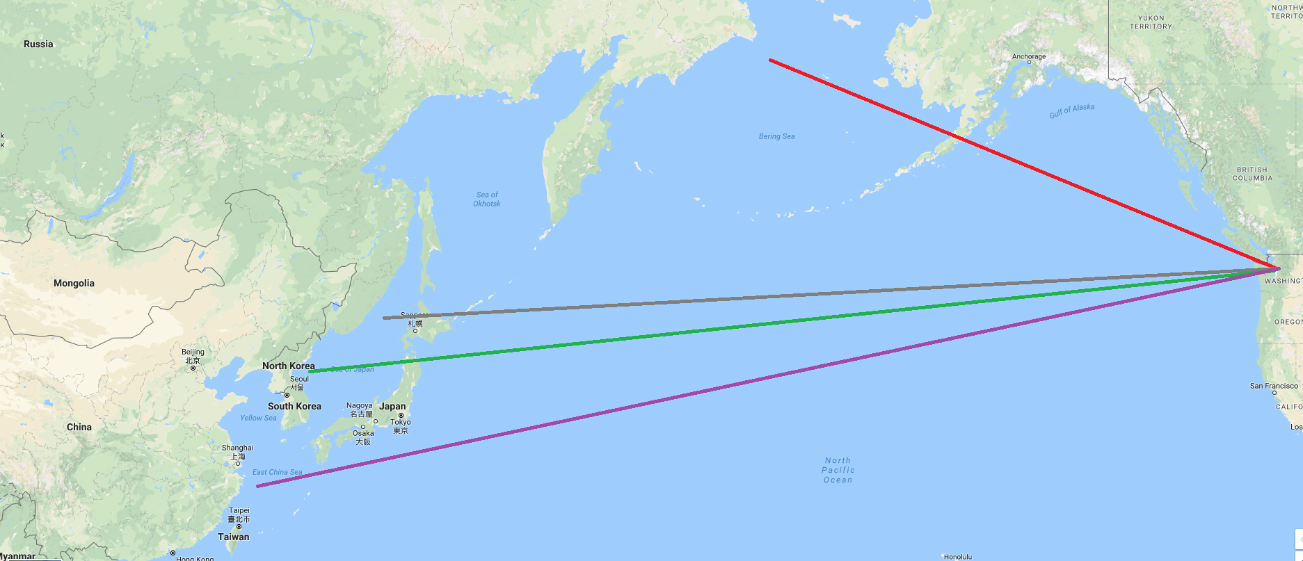 I strongly suspect the same is true of Carter’s most recent mission that earned the Jolly Roger. As my map below shows, there are numerous high-value target areas in reach of Carter’s home port. The red line leads to the Arctic, where Russian submarines like to hang around. The grey line leads to the Pacific Fleet headquarters of the Russian navy. The green line leads to waters off North Korea, and close to most of its missile launching sites. The purple line leads to China.