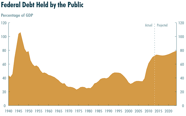 In 2014, even with lower deficits, public debt as a share of the economy will be at its highest level since 1950 at 74 percent – and that ratio will rise to 79 percent by 2024. Beyond that, the picture gets even worse.
