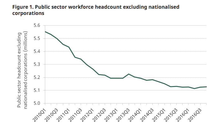 Ultimately, the matching of the national deficit to public sector wage concerns illuminates the broader issue here: Britain’s challenge is not that its public sector workers are underpaid, but rather that its government remains too big. Consider the chart below, it shows that even as the government has reduced spending, it has cut only a marginal percentage of its bloated workforce.