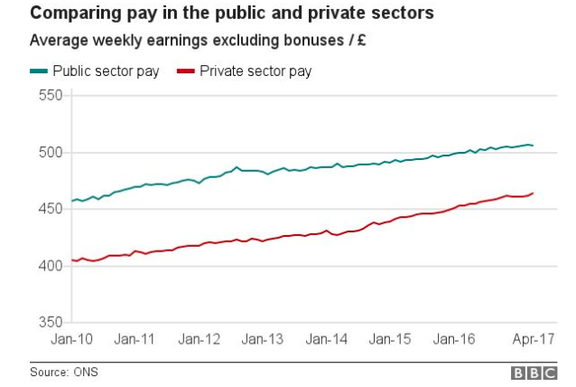 Still, the conservatives should be careful. While releasing pay caps for police officers and prison workers might be justified to retain experienced staff in those depleted sectors, most pay caps ought to remain in place. This isn’t just about long term economic stability, it’s about balancing private and public sector interests. Consider the fact that even today, and even excluding their higher pension returns, public sector workers receive higher salaries than their private sector counterparts.