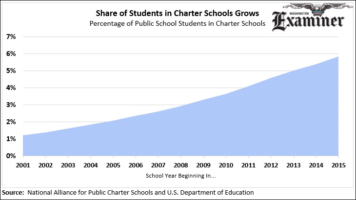 Charter schools now serve almost 6 percent of the public school student population. That’s up from just over one percent in the 2001-02 school year. Charter schools didn’t even exist in the United States until 1992, when the first one opened in Minnesota.