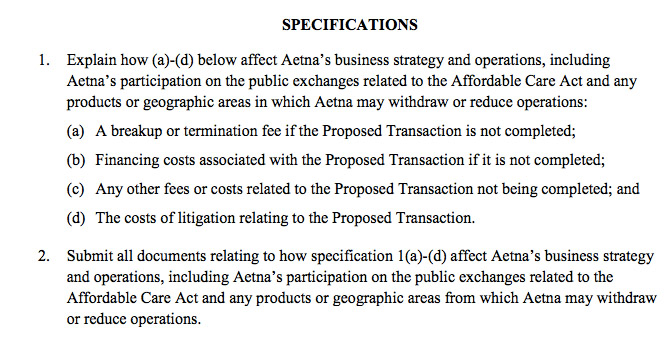 “Explain how [the transaction being blocked] affect Aetna’s business strategy and operations, including Aetna’s participation on the public exchanges related to the Affordable Care Act and any products or geographic areas in which Aetna may withdraw or reduce operations,” the DOJ demanded.