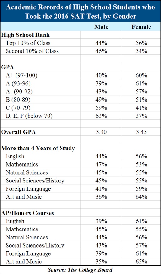 A majority (56 percent) of those in the top 10 percent of their class were girls, and most As and A+s were obtained by girls. Just 40 percent of A+s went to boys. Further down the grading scale, boys earned the majority (63 percent) of grades D and below. The overall GPA in 2016 was 3.45 for girls and 3.30 for boys. Girls also took more AP and honors classes, even in math and science.