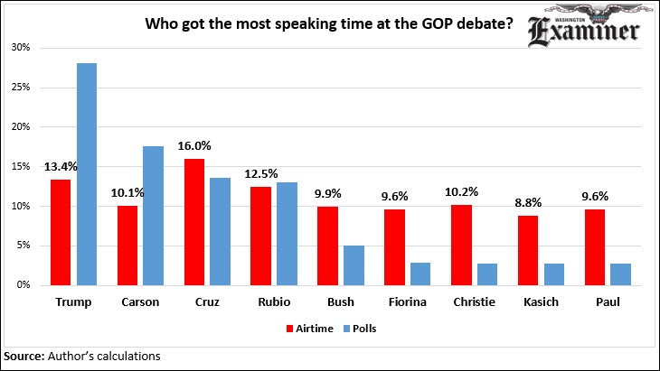 Cruz got 16 percent of the total speaking time. Donald Trump started slow, but ended in second with more than 13 percent of speaking time. Despite being second in the polls, Ben Carson spoke for just 10.3 minutes, well below the average of 11.4 minutes.