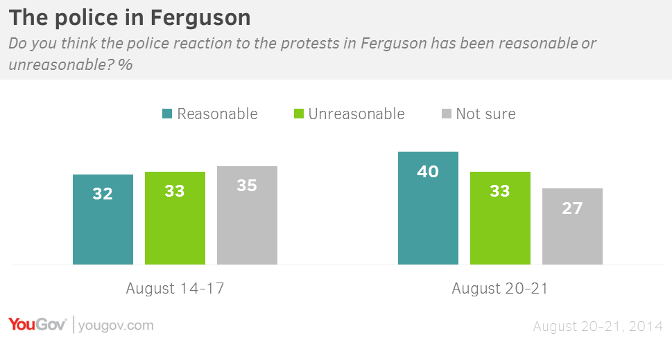 “This week’s survey suggests views opinions about Ferguson, in particular the police reaction to the protests there, have become even more racially polarized: 63 percent of blacks in the survey say the police reaction has been ‘unreasonable,’ up from 48 percent the previous week,” YouGov reported. “At the same time the number of whites who take the opposite view —that the police have been reasonable — has increased from 34 percent to 45 percent.”