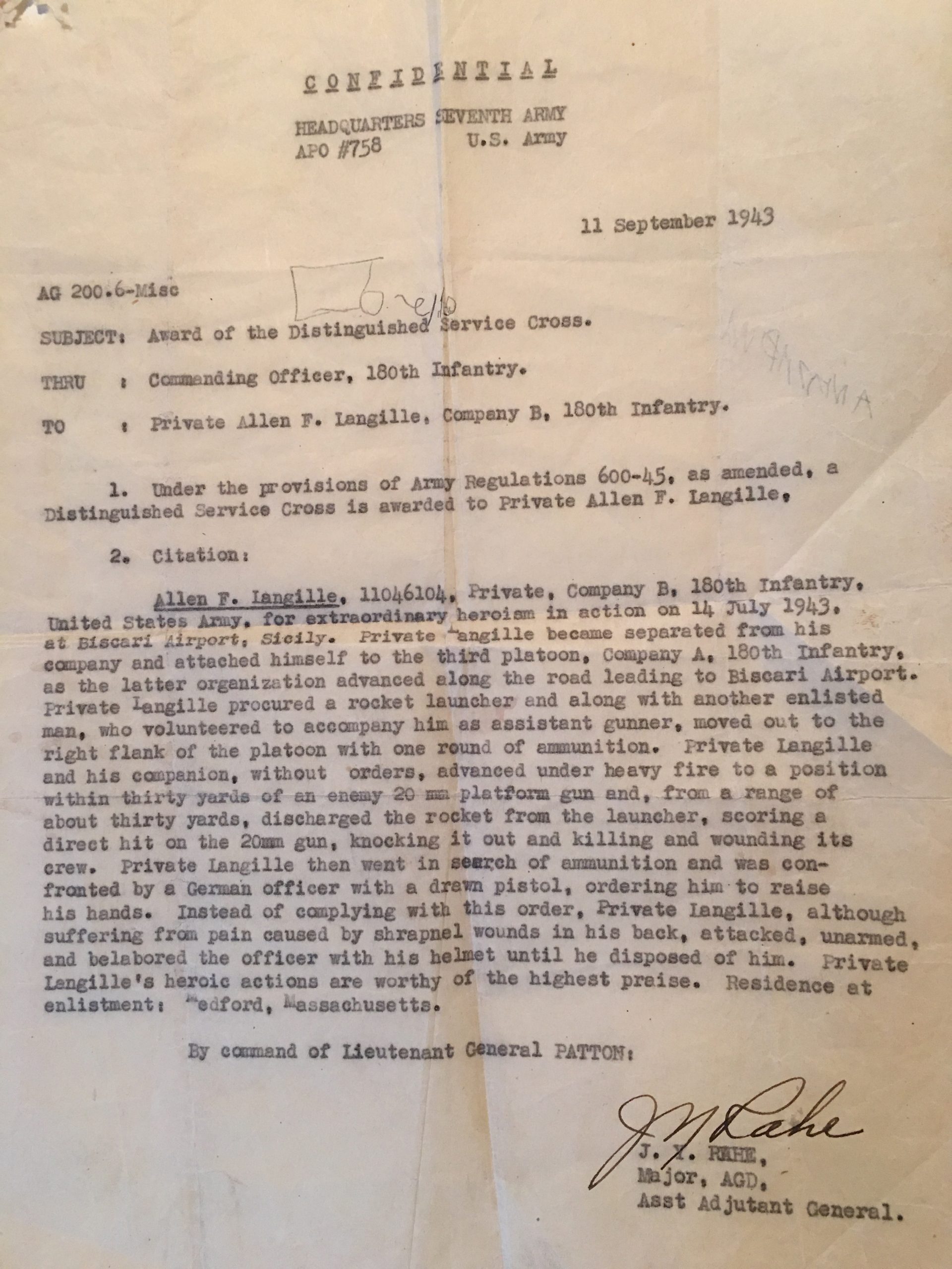 Private Allen F. Langille was killed in action during World War II when my father was only 3 years old. I never truly knew my grandfather’s incredible story until I came across a Purple Heart when I was snooping in my parents’ bedroom one day. The story of how he earned two Purple Hearts, a Bronze Star, and a Distinguished Service Cross is truly remarkable.