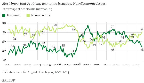 “Many more Americans now mention a non-economic issue — such as dissatisfaction with government, immigration, or ethical and moral decline — than an economic one as the top problem,” Gallup reported. “This reverses the situation found during much of the recession and its aftermath, when more Americans listed economic issues. The renewed focus on non-economic issues was first evident in May 2013, and the gap between economic and non-economic mentions has now widened to 33 points, with 71 percent of Americans mentioning non-economic issues and 38 percent citing economic issues.”
