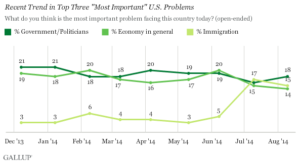“The government’s failure to act on immigration before the recess likely angered Americans who say immigration is the most important issue, and may be one reason mentions of immigration are elevated for a second month,” Gallup reported.