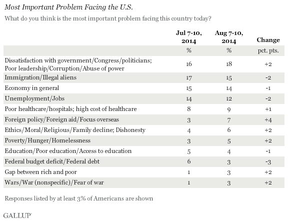“Twelve percent mention jobs or unemployment as the top problem, down from earlier this year. As 2014 began, jobs, the economy in general, dissatisfaction with government, and healthcare were the problems Americans mentioned most often. But last month, mentions of immigration surged 12 percentage points while slightly fewer Americans cited jobs, government, and healthcare,” the report added.