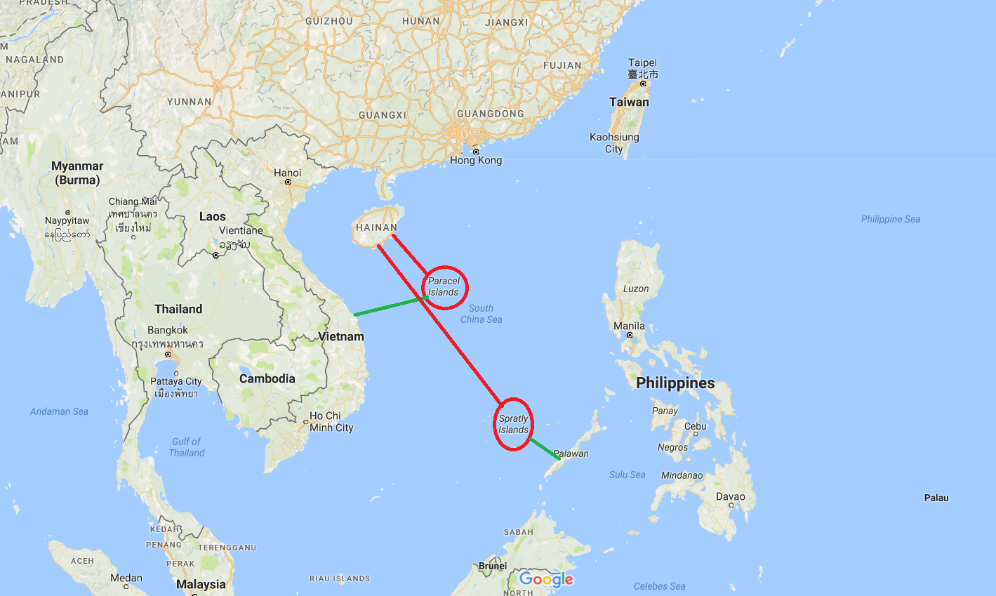 Still, China believes it owns the entire region of these waters. In the chart below, I have drawn lines of claims to the Paracel and Spratly islands, from China, Vietnam, and the Philippines. Considering the distance between China and the Spratly islands, in particular, it is clear China’s claims are absurd. The Spratly islands are 560 miles from China, but 85 miles from the Philippines.