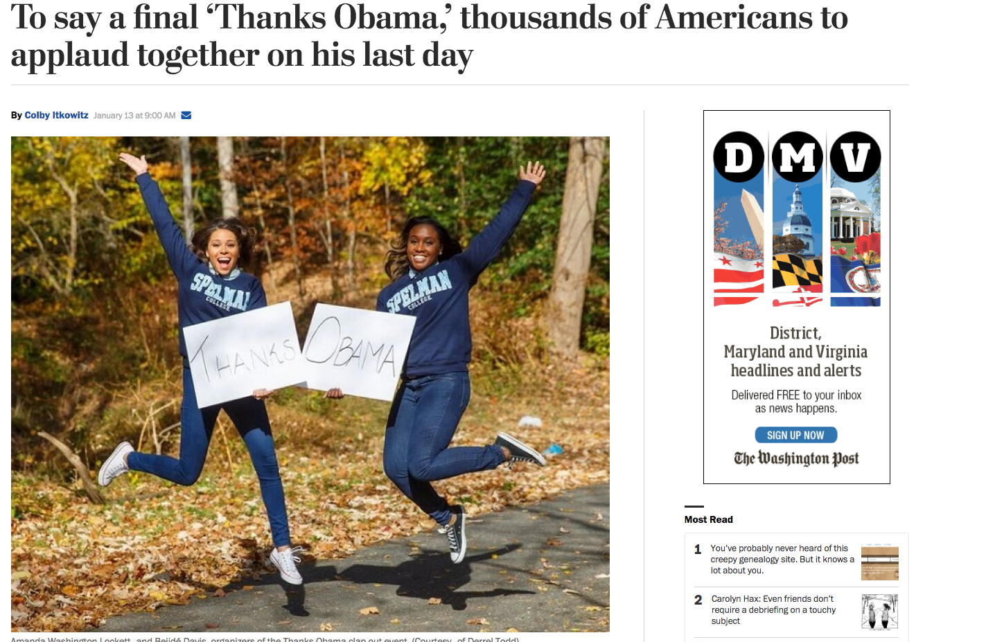 “To say a final ‘Thanks Obama,’ thousands of Americans to applaud together on his last day,” read the story’s headline.