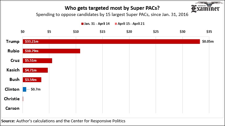 Super PACs aside, candidates are also attacking each other over the airwaves. A majority of negative campaign ads since Jan. 31, 2016 have hit Trump. Clinton has been attacked by just six different commercials portraying her negatively, and most of those came from conservative sources. The two most recent anti-Clinton ads came from the Cruz campaign and aired in Pennsylvania. The two most recent anti-Trump ads also came from Cruz, debuting on April 15 in New York and April 21 in Pennsylvania.