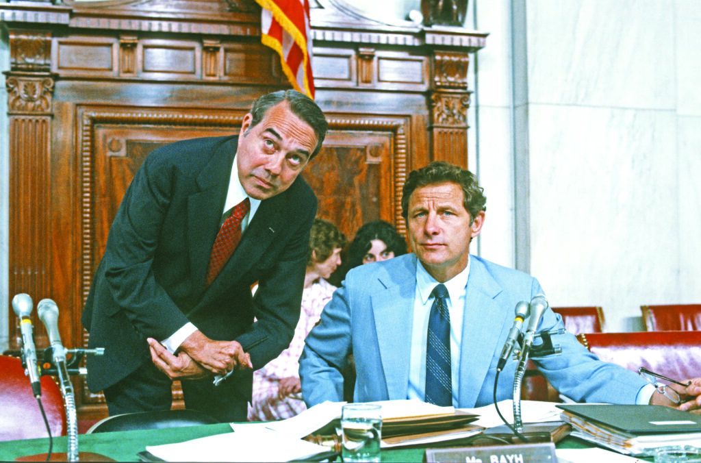 Sen. Bob Dole, left, and Sen. Birch Bayh talk together during a hearing in Washington, D.C., on Aug. 21, 1980. (Photo by Arnie Sachs/CNP/Getty Images)