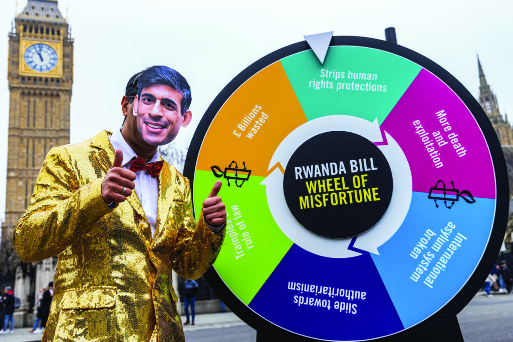 An actor in a Rishi Sunak mask poses protests in London’s Parliament Square against the Safety of Rwanda bill, March 11, 2024. (Mark Kerrison / In Pictures via Getty Images)