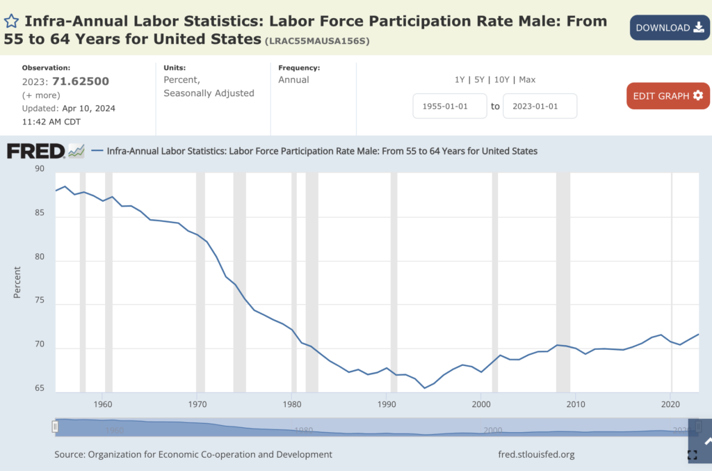 The problem lies in the next higher age bracket. Whereas the labor force participation rate among women aged 55 to 64 has risen over time to more than 60%, the male rate has collapsed from nearly 90% in the 1950s to just 71.6% today.