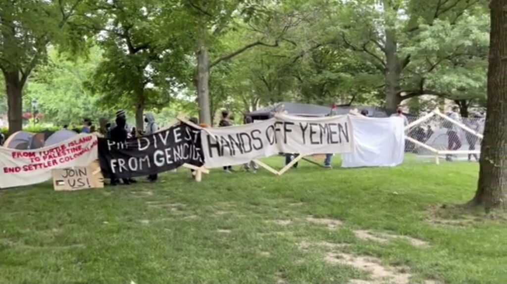 The activists, some involved in local Democratic politics and a few actual University of Pittsburgh students, erected a barricade and set up a fence around an encampment filled with small and large tents. The encampment has also included defacing the Cathedral of Learning, blocking the entrances, and defacing the Frick Fine Arts Building with antisemitic graffiti.