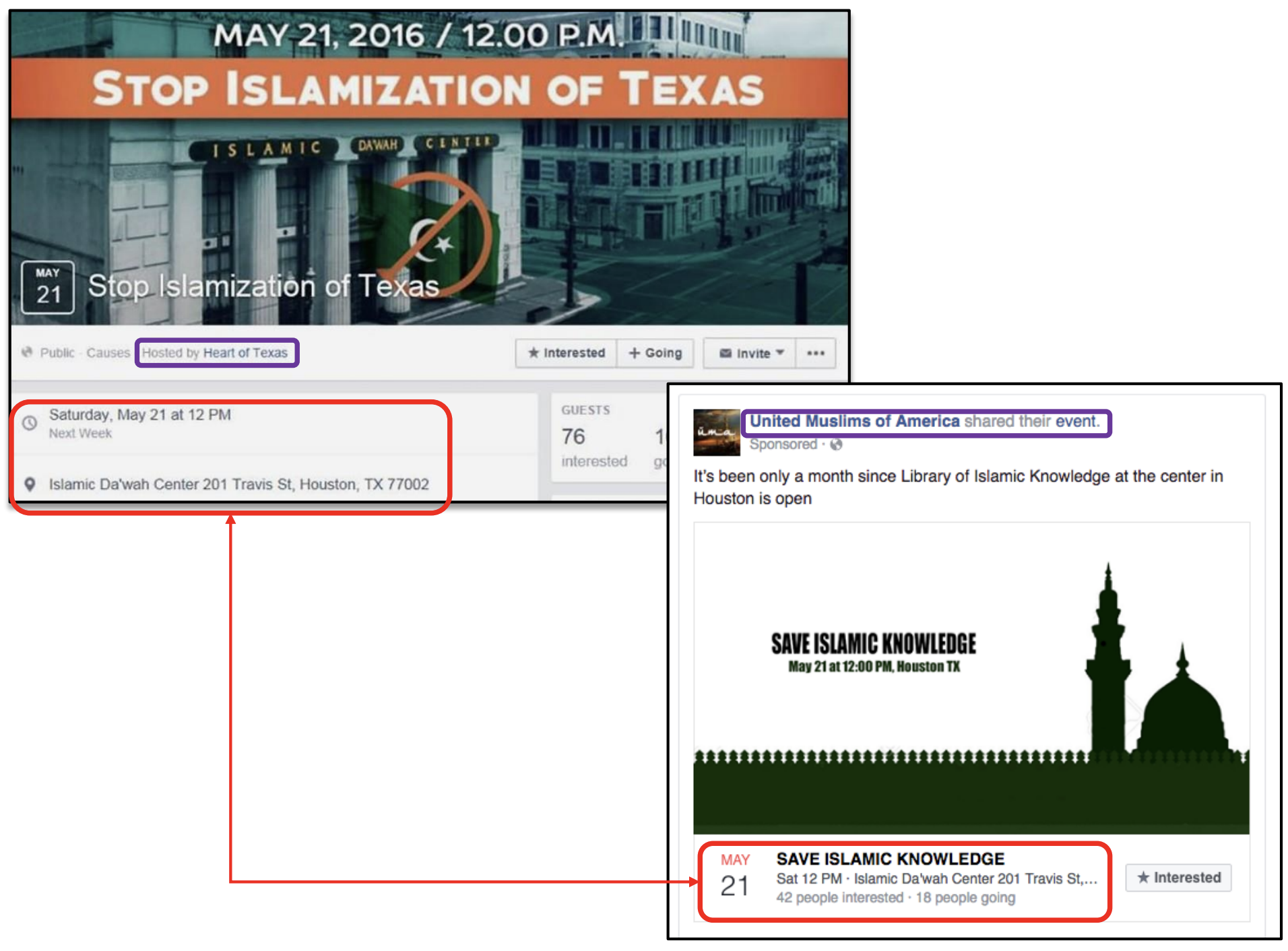 Then, Russia set up another Facebook group called “United Muslims of America” that set up a “Save Islamic Knowledge” event. That event was scheduled for Houston, on the same day as the “Heart of Texas” event.