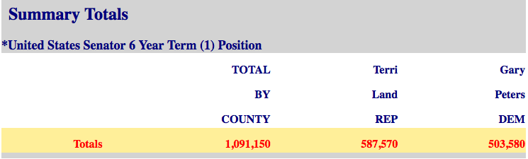 As of this writing, official Michigan Department of State election totals show that just over 1,000,000 votes were cast in Tuesday night’s primary. Land received 587,570 votes while Peters received 503,580.
