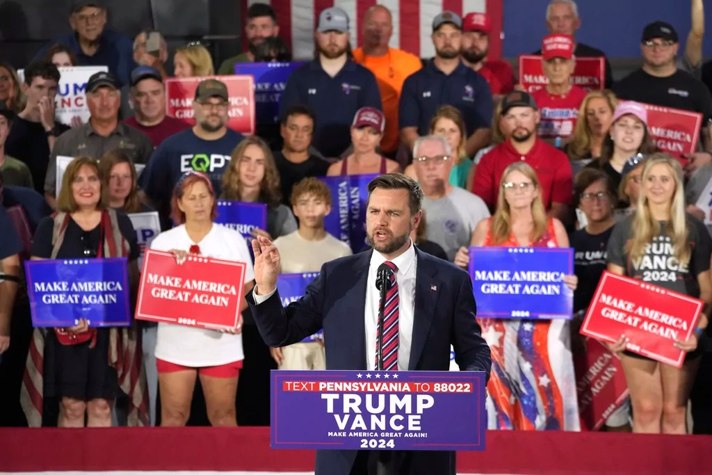 Sen. J.D. Vance (R-OH) speaks at a campaign event on Wednesday, Aug. 28, 2024, in Erie, Pennsylvania. (AP Photo/Gene J. Puskar)