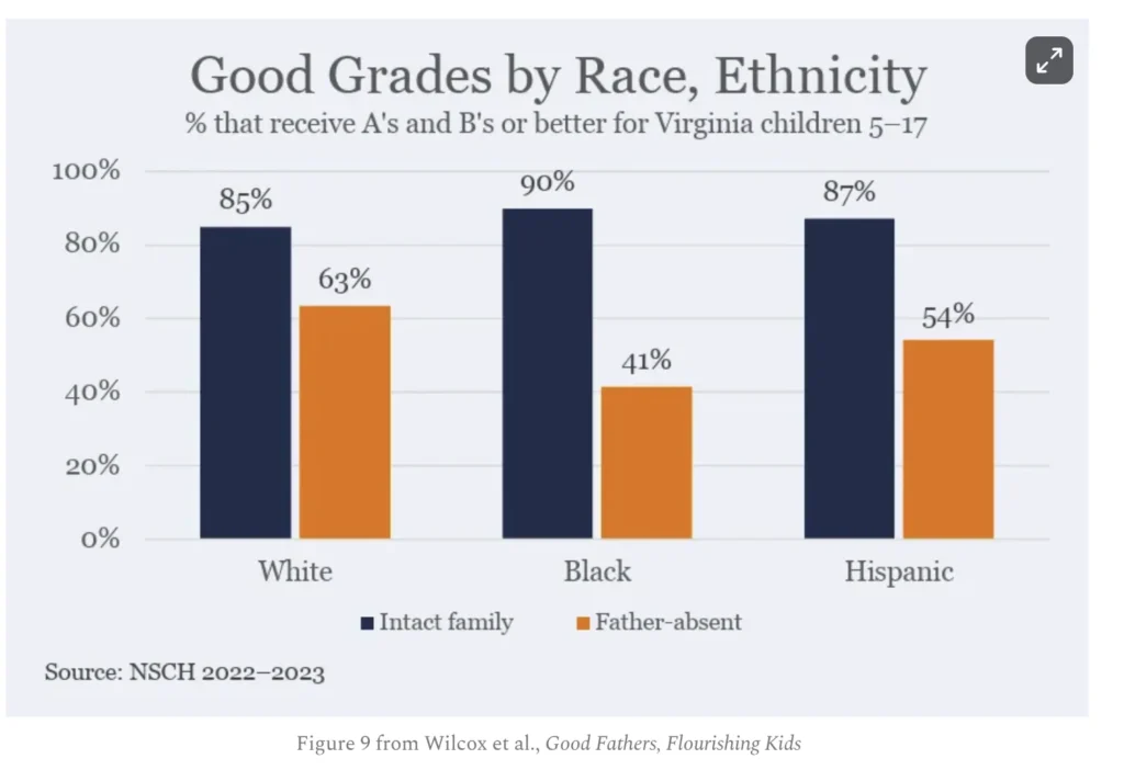 According to the data compiled by researchers at UVA, black children with a father in the home are actually more likely (90%) to get As and Bs than their white counterparts (85%). However, the effect of a missing father in the home is harsher for black children. While 63% of white children in homes without a father still manage to get As and Bs, just 41% of black children without a father in the home manage the same achievement.
